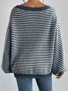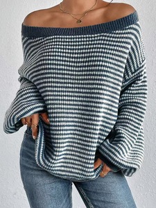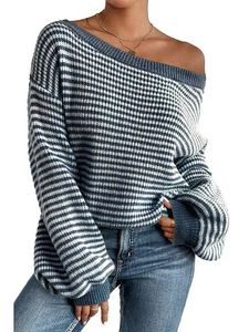 外贸欧美秋冬女装一字领露肩百搭针织衫撞色条纹灯笼袖毛衣女