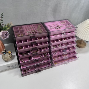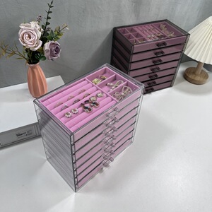 透明な7連ピンクジュエリーボックス[複数のコンパートメントを備えた2層スポンジ]