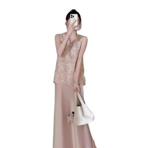 新しい中国風のスーツ、ピンクのノースリーブ花柄トップ、サテンスカート、スリムで美しいツーピースセット、軽くて大人のスタイル