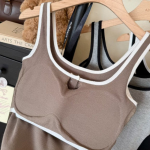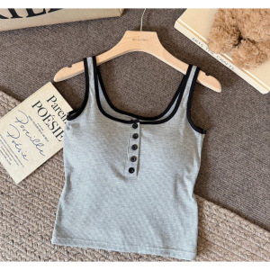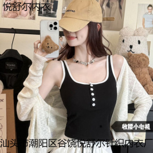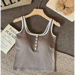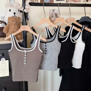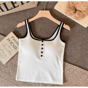 韓国風ホットガールコントラストカラーボタンキャミソール、胸パッド付き、スリムな細いストラップ、美しい背中、胸を包み込むノースリーブトップ