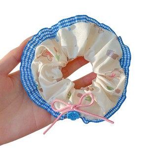 1#ブルーチェック柄ステッチ子猫大腸ヘアゴム-12cm