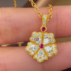 ヴィンテージ中世スタイルの赤いコランダム五葉のクローバーペンダントライト高級ハイエンドダイヤモンドがちりばめられた赤いコランダムフラワーネックレス女性用