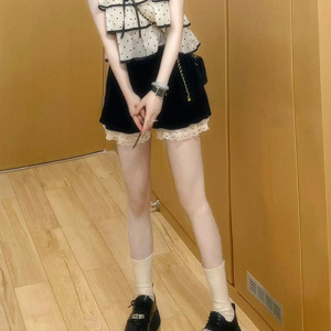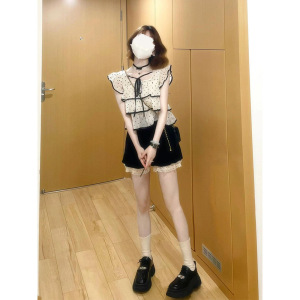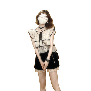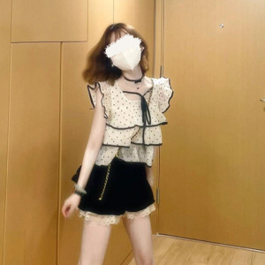 韓国の遊び心とキュートな女性用コントラストカラー水玉模様デザイン小飛袖ショートトップレーススカート2点セット