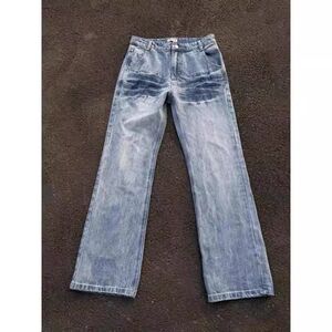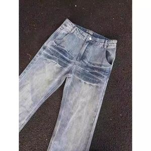 ライトブルーのライトニングパターンジーンズメンズ夏アメリカンハイストリートロングパンツバイブデザインシミターマイクロフレアパンツ