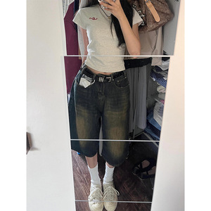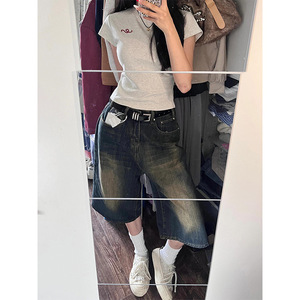 150小矮个子美式牛仔七分短裤女夏季复古宽松阔腿裤高腰直筒中裤