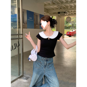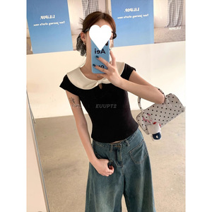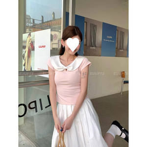 2025 コントラストカラーリボン人形襟半袖 Tシャツスリムフィットショートスタイルトップ純粋なカレッジスタイル