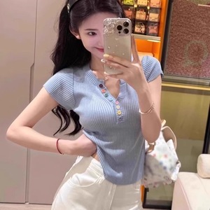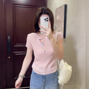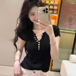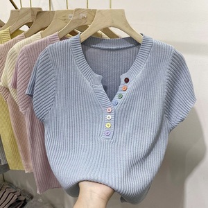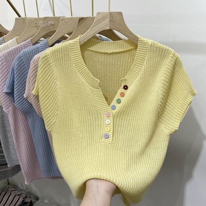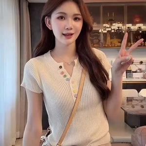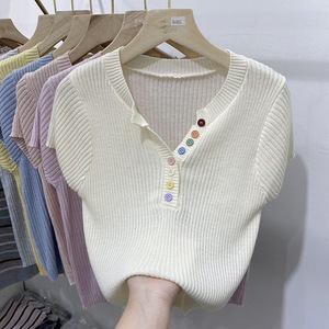 ブランド割引 2025 新しい夏の韓国スタイルのカラフルなボタンアイスシルク半袖セーター女性の多用途薄手のトップ