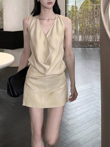 シンプルで高級感のある吊り襟ノースリーブトップスとスカートスーツ テンセルリネン気質の2点セット