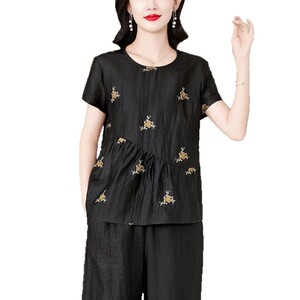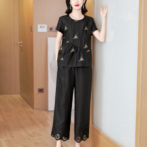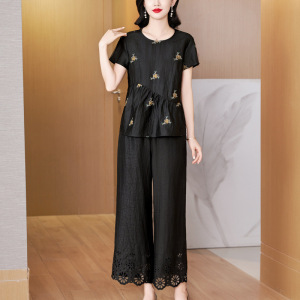 高品質大きいサイズ年齢を減らす中年女性の夏の新しいファッションシルクカメ柄トップ中空ワイドレッグパンツツーピーススーツ