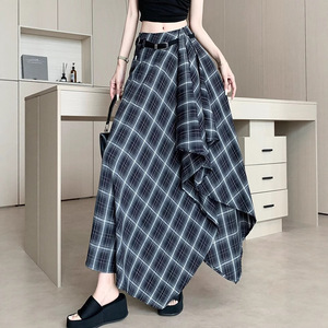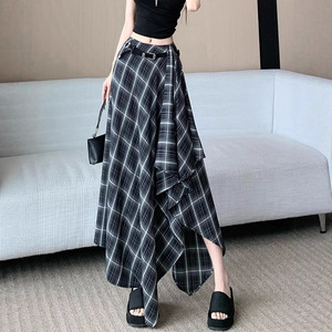 デザイン不規則チェック柄スカートレディース夏ミドル丈ハイウエストスリム気質Aラインスカート洋風スカート