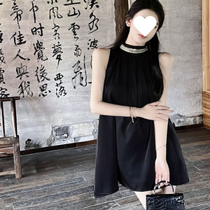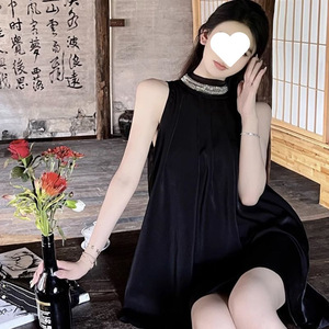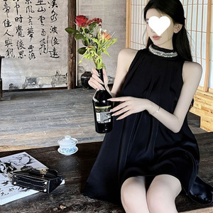 黒のサテンのホルターネックドレス女性の夏のスカート小柄なルーズ純粋な欲望オフショルダー気質ショートスカート