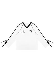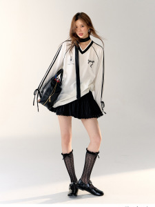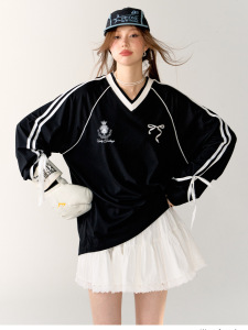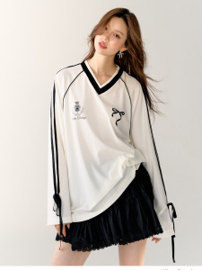 AsGony blokette アメリカンレトロスポーツボウジャージルーズVネック万能白長袖トップス