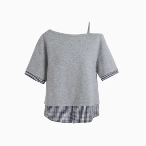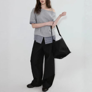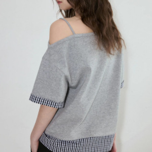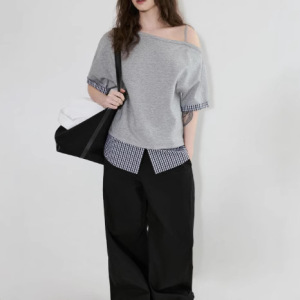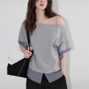 Fano ファッショナブルなオフショルダートップ女性のための 2025 春夏 miu チェック柄ステッチルーズフェイクツーピース Tシャツ