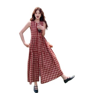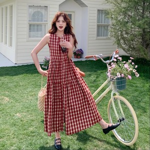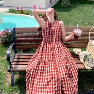 フレンチレッドチェック柄ノースリーブベストドレス女性のための夏の2025新しいデザインウエストドレス