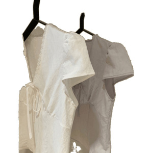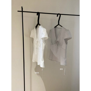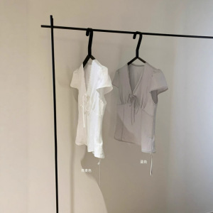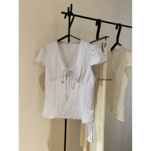 セナ【WGWE】優しい風レースVネック半袖シャツ韓国風スリムスイートリボントップス