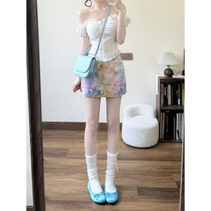 甘いバレエ風ガーリーウェア中空ワンラインカラートップカラー油絵花柄ヒップカバースカートスーツ