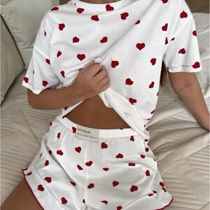 ヨーロッパとアメリカの新しいクロスボーダーラブプリントラウンドネック半袖ショーツレディースホームウェアパジャマツーピース半袖ショーツ