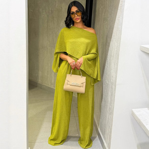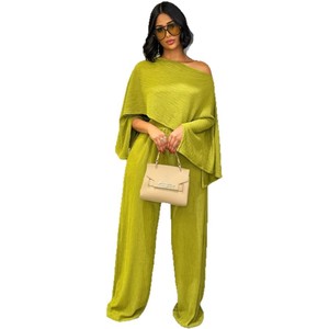 ヨーロッパとアメリカの女性のための三宅プリーツファッショナブルな気質の斜め肩不規則なトップとズボンアフリカの無地の女性用カジュアルスーツ