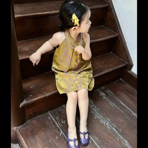 子供服女の子チャイナドレス 2025 新しい夏の薄いドレス子供の新しい中国風のレトロな黄色のベストドレス