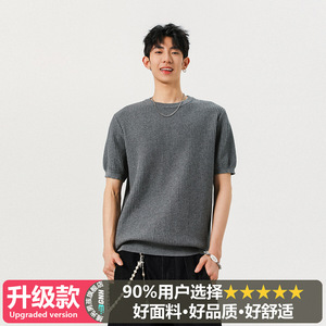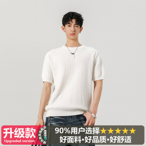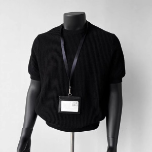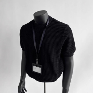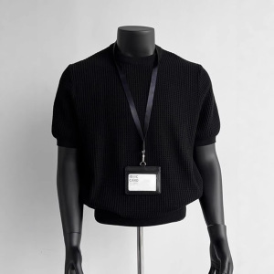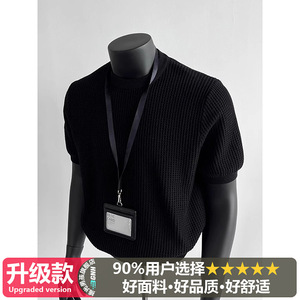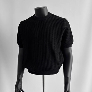 ブラック カフス ウエスト ニット Tシャツ メンズ 夏 アメリカン ワッフル テクスチャー 右肩 スリム 半袖 五分袖