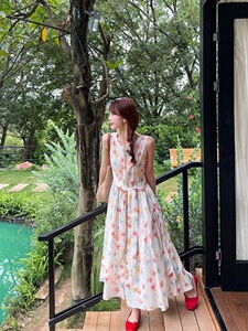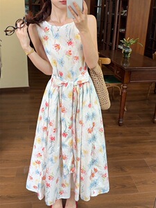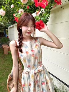 ドロップシッピングリアルショット初夏オレンジフラワーウエストタイベスト花柄ドレス