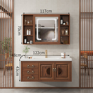 5V 新中国風無垢材一体型セラミックバスルームキャビネットスマートミラーコンビネーションバスルームシンク洗面台キャビネット