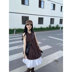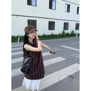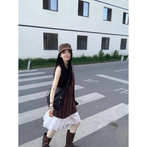 実物在庫あり、女性用の見事なスーツ、コーヒー色のストライプのノースリーブドレス、白いスカート、2点セット