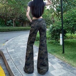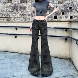 美式复古迷彩低腰微喇牛仔裤女2025夏季新款高街宽松显瘦拖地长裤