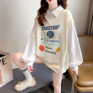 白文字長袖フェイクツーピース【ガールズウェア、高級で超カッコいいスウェットシャツ、胸ふふスウェットシャツ、韓国東大門ヒップホップov】