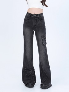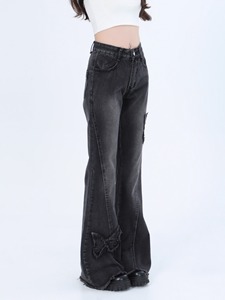 个性秋季美式复古蝴蝶拼接毛边牛仔裤女微喇叭宽松显瘦拖地裤子