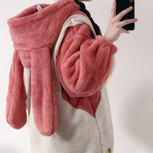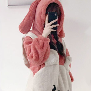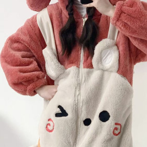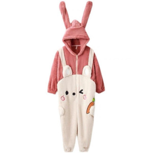 女性用ワンピースパジャマ、かわいい漫画のウサギのフード付きコーラルベルベット、冬用ベルベット、厚く暖かいフランネルホーム服