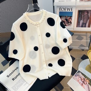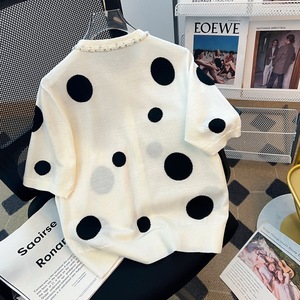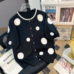 お買い得品! 85 ウール 15 マルベリーシルク ラウンドネック ビーズ ニット カーディガン 薄い黒と白の水玉模様の女性用半袖ジャケット