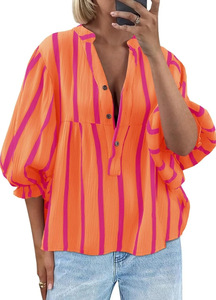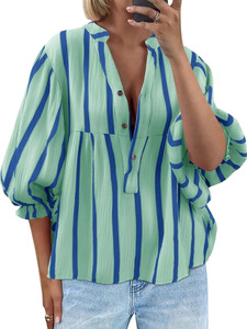 アマゾン越境欧米2025夏秋新作レディースストライプシャツパフスリーブゆったりトップス人気商品
