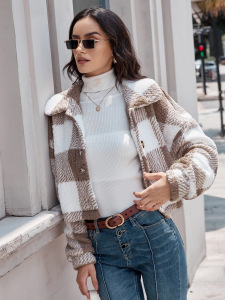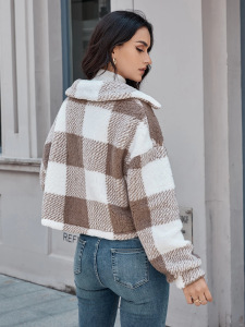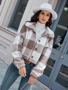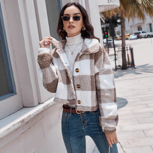 2025 秋冬新ヨーロッパとアメリカのクロスボーダー両面チェック柄ぬいぐるみボタンカーディガンカジュアルトップジャケット女性のショートスタイル