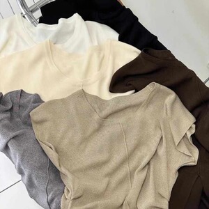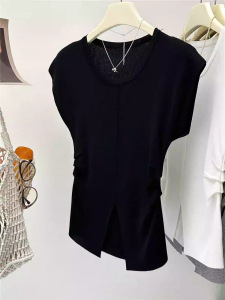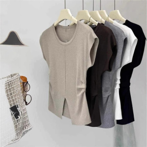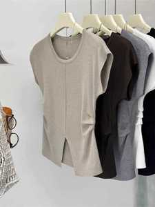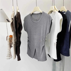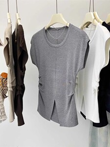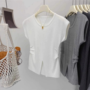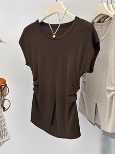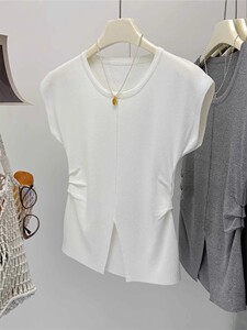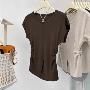 アイスシルクニット半袖Tシャツレディース夏薄手スリムファッションスリットプリーツウエストトップトレンディイン