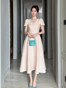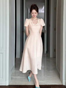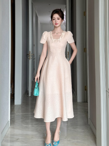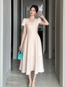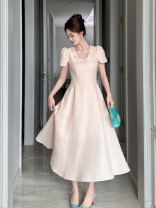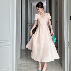 2025 新作夏の女性のドレスはエレガントでエレガントなスクエアネックビーズウエスト大きな裾ロングふわふわドレス 21716