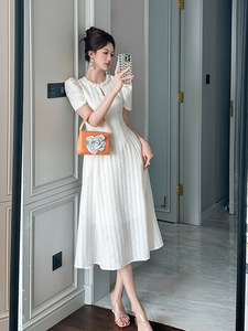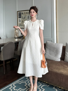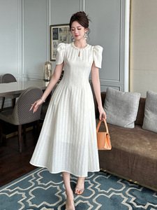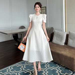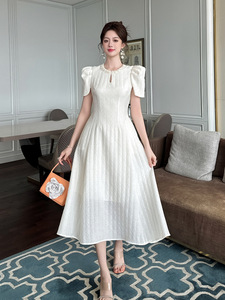 フレンチラウンドネックホワイトドレス女性のための 2025 夏の新しいスタイルウエスト大きな裾初恋キャップスリーブロングスカート 45178