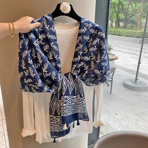エスニック風青と白のスカーフ女性のための春と夏の薄い綿とリネンのロングスカーフ旅行写真日焼け止めショールエアコンルームスカーフ