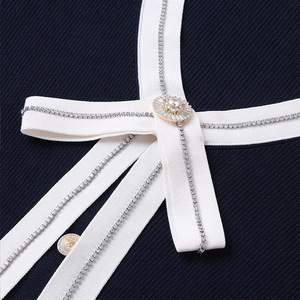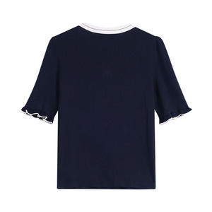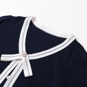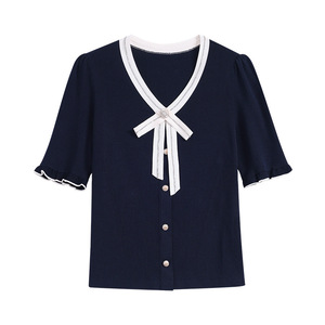デザイン V ネックリボン半袖ネイビーブルーセーター女性のための 2025 夏の新しい小さなアイスシルクトップ