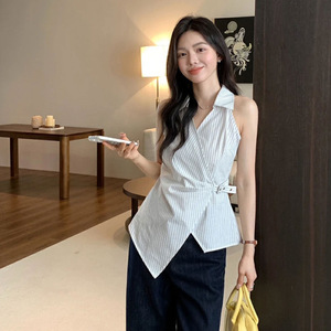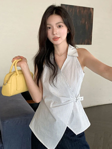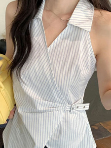 ブルーカラーストライプオフショルダーノースリーブシャツ女性の夏のアウターウェア美しいピンチウエストストラップノースリーブトップ