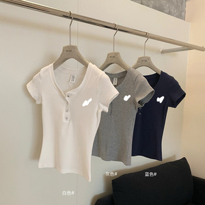 WGWE5854 レター刺繍ヘンリーカラー半袖Tシャツ スリムフィットデザイントップス