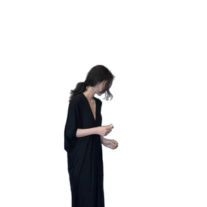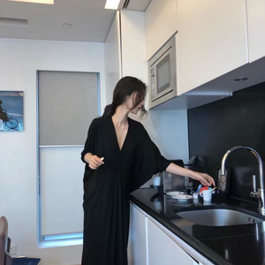 黑色莫代尔T恤连衣裙女中长款宽松大码慵懒v领裙子过膝蝙蝠袖显瘦