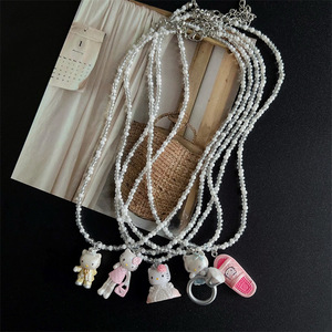 バッグを持った足の長いキティ---シルバーホワイトライスビーズネックレス