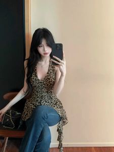 レトロヒョウ柄ビューティーバックVネックホルターネックキャミソールレディース夏ホットガールスリムフィットノースリーブアウターデザイントップ