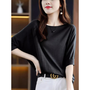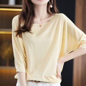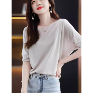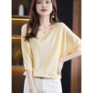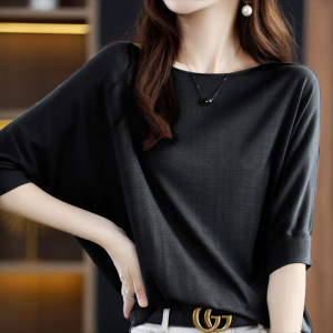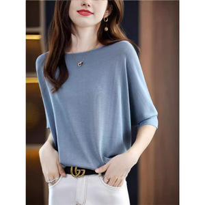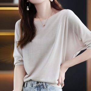 2024 新しい夏のラウンドネックセーター女性の半袖女性のルーズレイジースタイルバットシャツ薄い西洋スタイルミッドスリーブトップ