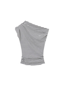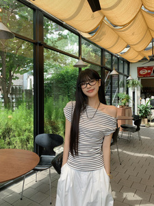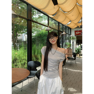 ストライプワンショルダー半袖Tシャツレディース2025夏新作韓国風スリムフィットオフショルダー外国貿易トップ