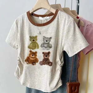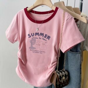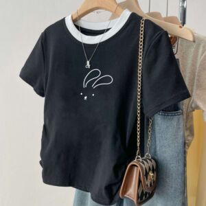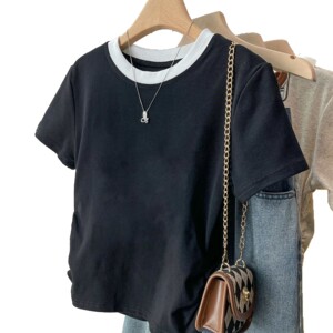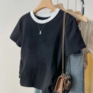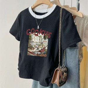 アメリカンスタイルの右肩純綿半袖シャツ女性の夏の新しいボトリングシャツスリムデザインホットガールショートトップトレンディ