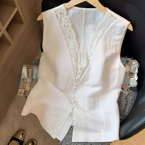 オールドマネースタイルフレンチレーススプライシングvネックリネンベスト女性のための2025夏の新しいハイエンドノースリーブトップ