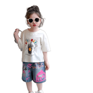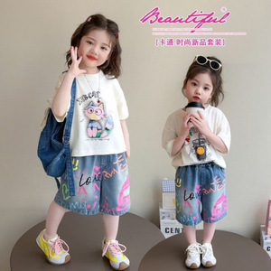 女童夏季薄款套装2025新款中大童儿童印花短袖T恤女孩牛仔两件套
