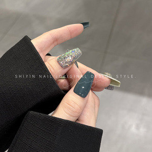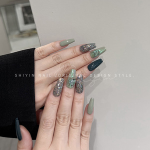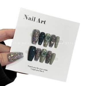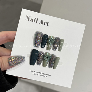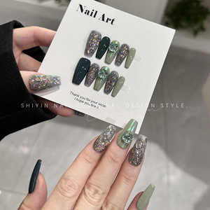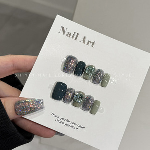 A350 ダークグリーン爆発グリッターモデル時音純粋な手作りウェアラブルネイルミントウェーブダイヤモンドホワイトフェイクネイルステッカー